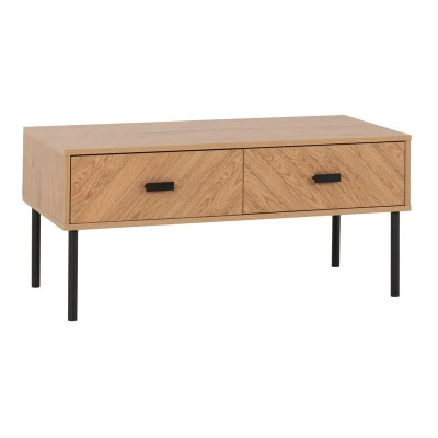 General description The Leon 2 Drawer Coffee Table combines functionality and style, featuring a medium oak effect finish that complements various interior designs. Technical specifications Dimensions: L49.5 x W100 x H46 cm Weight: 19 kg Material: Composite board, 3D paper veneer, 3D plastic veneer, MDF drawer base Metal handle, metal drawer runners, and metal feet