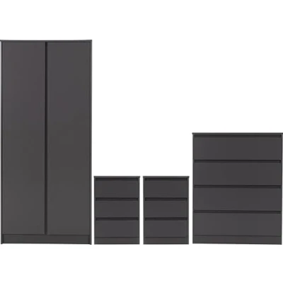 Seconique Malvern 2 Door Wardrobe Bedroom Set in Grey 2 Door Wardrobe W 800mm x D 505mm x H 1800mm 4 Drawer Chest W 800mm x D 400mm x H 1000mm 3 Drawer Bedside W 400mm x D 400mm x H 600mm Consists of 1 x 2 Door Wardrobe, 1 x 4 Drawer Chest & 2 x 3 Drawer Bedsides This product will be shipped in several packages;They may be delivered at different times