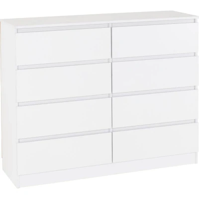 General description The Malvern 8 Drawer Chest is a stylish and functional storage solution, perfect for organizing your belongings while adding a modern touch to your space. Technical specifications Dimensions: L40 x W121.5 x H100 cm Weight: 52.5 kg Material: Composite board, paper veneer, plastic veneer, MDF back panel, MDF drawer base, metal drawer runners, plastic feet