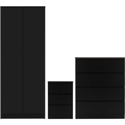Seconique Malvern Trio in Black Consisting of 2 Door Wardrobe, 4 Drawer Chest & 3 Drawer Bedside 2 Door Wardrobe W 800mm x D 505mm x H 1800mm 4 Drawer Chest W 800mm x D 400mm x H 1000mm 3 Drawer Bedside W 400mm x D 400mm x H 600mm This product will be shipped in several packages;They may be delivered at different times