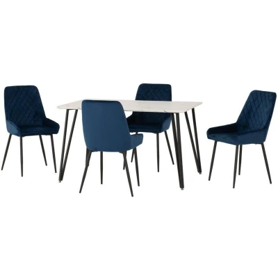 Seconique Marlow Dining Set with Avery Chairs in White Marble Effect/Black/Sapphire Blue Velvet