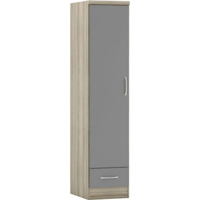 General description The Nevada 1 Door 1 Drawer Wardrobe combines functionality and style, featuring a modern grey gloss finish with a light oak effect veneer. This wardrobe is designed to fit seamlessly into any bedroom decor while providing ample storage space. Technical specifications Dimensions: L52 x W40 x H182.5 cm Weight: 31.4 kg Material: Composite board with 3D paint effect and 3D plastic veneer MDF back panel and drawer base Metal handle, hinges, and drawer runners Metal hanging rail Plastic feet