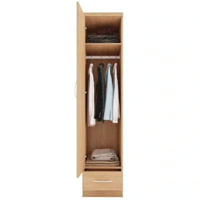 General description The Nevada 1 Door 1 Drawer Wardrobe combines functionality and style, featuring a modern Sonoma oak effect finish that enhances any bedroom decor. Technical specifications Dimensions: L52 x W40 x H182.5 cm Weight: 31.4 kg Material: Composite board with 3D paint effect and 3D plastic veneer MDF back panel and drawer base Metal handle, hinges, and drawer runners Metal hanging rail Plastic feet