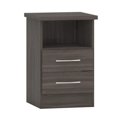 General description The Nevada 2 Drawer Bedside is a stylish and functional addition to any bedroom, featuring a modern black wood grain finish. It is designed to provide ample storage with two spacious drawers, making it perfect for keeping your essentials within reach. Technical specifications Dimensions: L40 x W40 x H61 cm Weight: 12.54 kg Material: Composite board with 3D paint effect, MDF back panel, MDF drawer base Handle: Metal Drawer runner: Metal Feet: Plastic