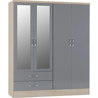 Seconique Nevada 4 Door 2 Drawer Wardrobe in Grey Gloss/Light Oak Effect Veneer