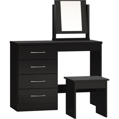 General description The Nevada 4 Drawer Dressing Table Set in Black Gloss is a stylish and functional addition to any bedroom. It features a sleek design with ample storage space, making it perfect for organizing your beauty essentials. Technical specifications Dressing Table Dimension: L40.5 x W100 x H77 cm Stool Dimension: L35 x W40 x H42 cm Mirror Dimension: L9 x W44 x H49.5 cm Total Weight: 34.9 kg Material: Composite board, Plastic veneer, MDF back panel, MDF drawer base, Metal handle, Metal drawer runner, Plastic feet, Mirrored glass, Plastic back panel strip
