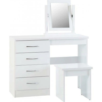 General description The Nevada 4 Drawer Dressing Table Set in White Gloss is a stylish and functional addition to any bedroom. It features a sleek design with ample storage space, making it perfect for organizing your beauty essentials. Technical specifications Material: Composite board with plastic veneer MDF back panel and drawer base Metal handle and drawer runner Plastic feet Mirrored glass Plastic back panel strip Dressing Table Dimensions: L40.5 x W100 x H77 cm Stool Dimensions: L35 x W40 x H42 cm Mirror Dimensions: L9 x W44 x H49.5 cm Total Weight: 34.9 kg