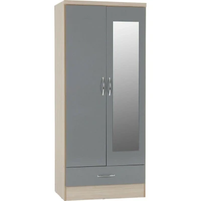 Seconique Nevada Mirrored 2 Door Wardrobe in Grey Gloss/Light Oak Effect Veneer