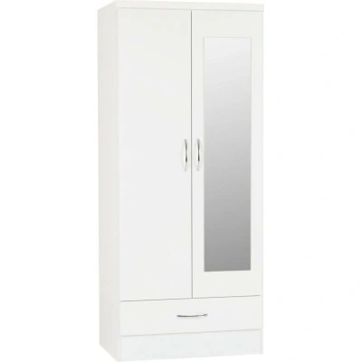 General description The Nevada Mirrored 2 Door 1 Drawer Wardrobe combines functionality and style, featuring a sleek white gloss finish and a full-length mirrored front that enhances any bedroom decor. Technical specifications Dimensions: L52 x W78 x H182.5 cm Weight: 48 kg Material: Composite board with plastic veneer MDF back panel and drawer base Metal handle and hinges Metal hanging rail and drawer runners Plastic back panel strip and feet Mirrored glass