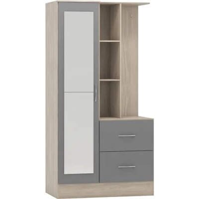 AmazonSeconique Nevada Mirrored Open Shelf Wardrobe in Grey Gloss/Light Oak Effect Veneer W 940mm x D 520mm x H 1835mm Part of the extensive Nevada range at Seconique Other finishes also available Item shape: Rectangular Number of drawers: 2 This product will be shipped in several packages;They may be delivered at different times