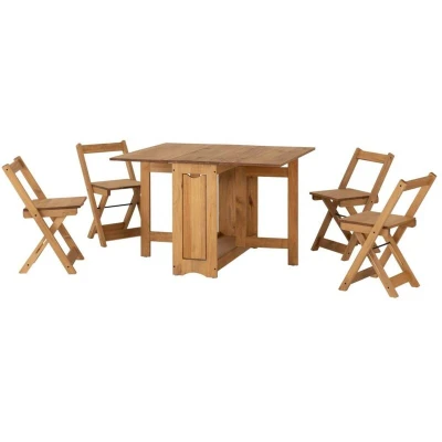 Maximise your dining space with the Santos Butterfly Dining Set, crafted from solid pine and finished in a rustic natural wax. This clever set features a fold-out butterfly table and four matching chairs that tuck neatly inside—perfect for compact homes, kitchens, or studio apartments. Whether you're hosting guests or enjoying everyday meals, the Santos set offers flexibility, charm, and smart storage in one timeless package. Product Material: Pine/Metal Hinges/Metal Bar/Plastic Feet Dimensions & Weight: Dimensions: L92 x W115 x H75.5 cm L92 x W38.5 x H75.5 cm L49 x W39.5 x H73 cm Weight: 38 kg . Santos Butterfly Dining Set (X4 Chairs) - Natural Wax . Delivery is free to UK Mainland, excluding AB31 to AB38, AB40 to AB56, IV, KA27 & KA28, KW, PA20 to PA78, PH4 to PH50 and ZE in Scotland; BT for Northern Ireland; all postcodes within the Republic of Ireland where a surcharge will apply, please check before ordering.. 3#5