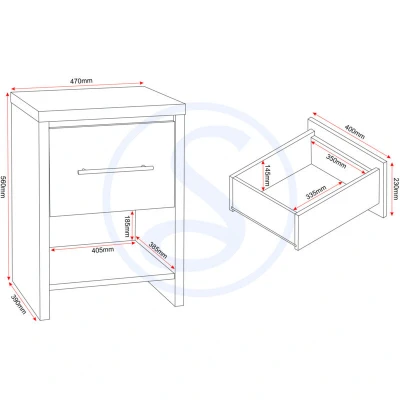 General description The Seville 1 Drawer Bedside is a stylish and functional addition to your bedroom, featuring a modern grey high gloss finish combined with a light oak effect veneer. Technical specifications Dimensions: L39 x W47 x H56 cm Weight: 12 kg Material: Composite board, paper veneer, plastic veneer, MDF back panel, MDF drawer base Metal handle and metal drawer runners Plastic feet