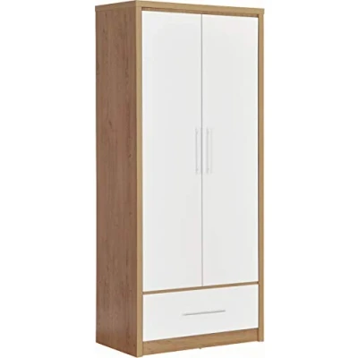 General description The Seville 2 Door 1 Drawer Wardrobe combines functionality and style, featuring a sleek white high gloss finish with a light oak effect veneer. This wardrobe is designed to provide ample storage space while enhancing the aesthetic of your room. Technical specifications Dimensions: L47 x W76 x H180 cm Weight: 40.9 kg Material: Composite board, paper veneer, plastic veneer, MDF back panel, MDF drawer base Metal handle and drawer runners Plastic feet Metal hinges and hanging rail