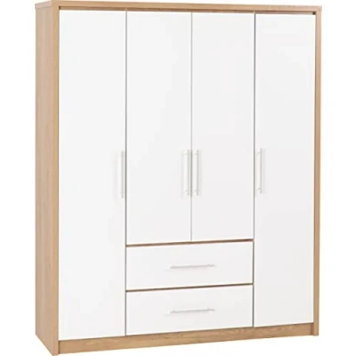 Seconique Seville 4 Door 2 Drawer Wardrobe in White Gloss/Light Oak Effect Veneer