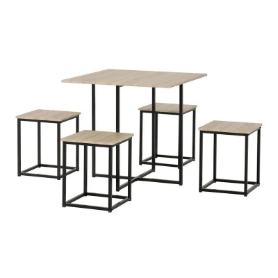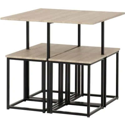 General description The Kent 1+4 Stowaway Dining Set features a stylish Sonoma Oak effect finish combined with a sleek black metal frame, making it a perfect addition to any modern dining space. This set includes a table and four stools that can be conveniently stowed away when not in use. Technical specifications Table Dimension: L80 x W80 x H76 cm Stool Dimension: L36 x W36 x H45 cm Total Weight: 20 kg Material: Composite board with 3D paper veneer Frame: Metal
