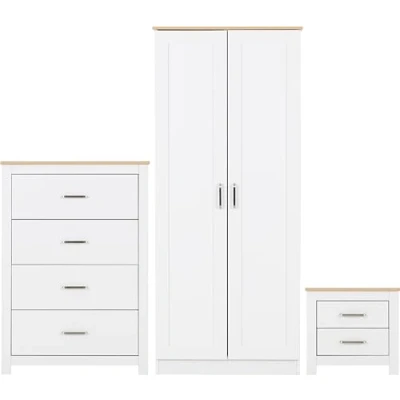 SeconiquePortland Trio Bedroom Set in White/Oak Effect 2 Door Wardrobe W 800mm x D 535mm x H 1875mm 4 Drawer Chest W 800mm x D 400mm x H 1140mm 2 Drawer Bedside W 500mm x D 400mm x H 455mm METAL DRAWER RUNNERS METAL HANGING RAIL, METAL HANDLES, METAL HINGES