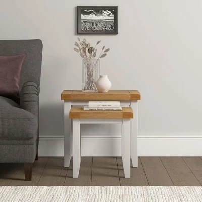 AmazonChoice of three finishes – Natural Oak, Pebble Grey with Oak top, or Ivory with Oak top, so it’s easy to match your space. Fully assembled – delivered ready to use, so you can enjoy it straight out of the box. Space-saving design – smaller table nests neatly under the larger one when not in use. Versatile use – perfect as side tables, coffee tables, or for extra space when guests arrive. Classic style with modern touches – blends timeless charm with a fresh finish.