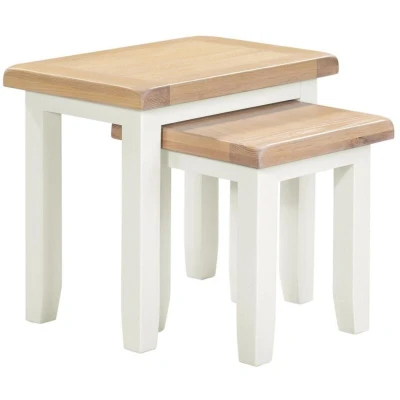The Windsor Nest of 2 Tables offers a practical and stylish solution for flexible living spaces. Made from durable materials with a natural oak or painted finish, these two tables nest neatly together to save space when not in use. The clean, classic design features gently rounded edges and a smooth tabletop, ideal for holding drinks, snacks, or decorative items. Whether used as occasional tables, side tables, or for entertaining guests, they provide both convenience and elegance. Perfect for modern and traditional homes alike, the Windsor Nest of 2 Tables combines functionality with timeless style. Product Material: Oak/Hardwood/Painted Finish (Matt) Dimensions & Weight: Dimensions: L37 x W54 x H50 cm L37 x W37 x H42 cm Weight: 14 kg . Windsor Nest of 2 Tables - Ivory/Oak . Delivery is free to UK Mainland, excluding AB31 to AB38, AB40 to AB56, IV, KA27 & KA28, KW, PA20 to PA78, PH4 to PH50 and ZE in Scotland; BT for Northern Ireland; all postcodes within the Republic of Ireland where