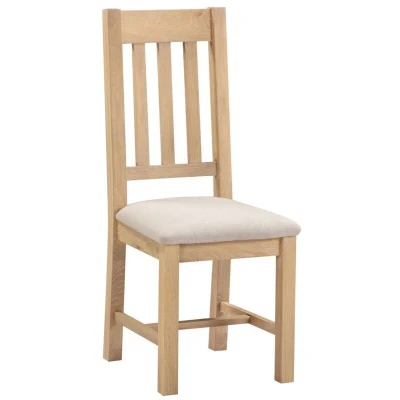 The Windsor Slatted Dining Chair (x2 per box) in Natural Oak with Oat Fabric brings classic warmth and comfort to your dining space. Crafted from solid wood with a natural oak finish, these chairs feature a timeless slatted back design that adds traditional charm. The cushioned seat is upholstered in soft oat-colored fabric, offering a neutral and inviting look that suits a wide range of décor styles. Built for everyday use, these chairs combine sturdy construction with comfortable seating. Perfectly matched with the Windsor dining tables, this set of two adds elegance and practicality to any dining room. Product Material: Oak/Fabric/Foam Dimensions & Weight: Dimensions: L41 x W46 x H105.5 cm Weight: 15 kg . Windsor Slatted Dining Chair (X2 Per Box) - Natural Oak/Oat Fabric . Delivery is free to UK Mainland, excluding AB31 to AB38, AB40 to AB56, IV, KA27 & KA28, KW, PA20 to PA78, PH4 to PH50 and ZE in Scotland; BT for Northern Ireland; all postcodes within the Republic of Ireland