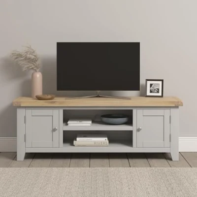 The Windsor Straight TV Unit in Pebble Grey/Oak brings a fresh, modern touch to your living space with its soft grey painted base and contrasting natural oak top. Its straight, clean lines offer a timeless design that suits both classic and contemporary interiors. This unit features two open shelves perfect for media players and gaming consoles, along with two spacious drawers to neatly store remotes, cables, and other accessories. Crafted from durable materials, it provides reliable support for TVs up to 55 inches. The Pebble Grey/Oak finish adds a subtle yet stylish look, making it a practical and elegant centerpiece for any lounge. Product Material: Oak/Hardwood/Painted Finish (Matt)/Plywood Back Panel/Metal Handles/Plastic Feet Dimensions & Weight: Dimensions: L37 x W140 x H50.5 cm Weight: 22 kg . Windsor Straight TV Unit - Pebble Grey/Oak . Delivery is free to UK Mainland, excluding AB31 to AB38, AB40 to AB56, IV, KA27 & KA28, KW, PA20 to PA78, PH4 to PH50 and ZE in Scotland; BT