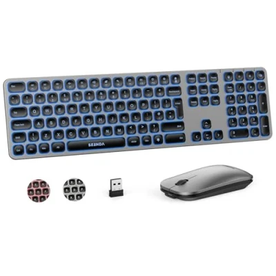 Plug and Play for Easy Use: This wireless keyboard and mouse set operates through a single unified usb receiver for clutter-free connectivity. Simply plug the nano USB receiver (stored on the bottom of mouse) into your computer's USB port for instant dual-device functionality. Compatible with all USB-enabled Windows XP/7/8/10/11 systems and laptops/PCs. 3-Color Adjustable Backlight Keyboard: Customize your workspace with three vibrant backlight options (red/white/blue) featuring dimmable brightness settings. The illuminated keys ensure effortless typing in low-light conditions. USB-C Rechargeable: The keyboard and mouse set is equipped with rechargeable batteries that enable normal working time after rapid 1-3 hour charging via included Type-C charging cable. The wireless keyboard can be used for up to 200 hours without backlight. Smart auto-sleep mode activates after 10 minutes of inactivity for saving power. (press any key to wake). Whisper-quiet& Responsive Typing: Low profile concave keycaps shaped to finger contours, scissor-switch mechanism for responsive, soft and whisper-quiet keystrokes, which greatly provides a comfortable typing experience. You will also receive a transparent silicone cover to keep your keyboard from dust. Low Profile and Ultra Thin Design: Super slim, but sturdy enough. A pratical mouse and keyboard set with a sleek and stylish look. Full size qwerty layout, fn multimedia keys, numeric keypad are all included, suitable for home and office use.