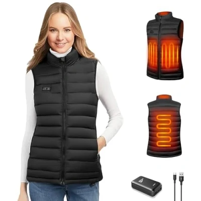 【4 Heated Elements】Compared to other heated vests on the market featuring multiple heating zones, our heated gilet womens requires only four heating zones to deliver sufficient warmth to the body's core. This helps maintain body temperature, promotes blood circulation, and relief from winter muscle soreness in the chilly and damp days. These zones include the left abdomen, right abdomen, neck, and back.🔥Tips: We recommend referring to our size chart for optimal comfort and fit. 【2 Power Buttons & 3 Heat Settings】This heated gilet for women with 3 heat settings: HIGH - Red LED (50℃-55℃/131℉);MEDIUM - White LED (45℃-50℃/122℉); LOW - Blue LED (40℃-45℃/113℉).You can adjust the warmth according to your need. There are individual switches for the back and front zones, 2 power buttons for easy control. You are free to choose to heat all zones at the same time or to select specific zones. 【Heated Vest With Power Bank】Our heated gillette women comes with a powerful 10000mAh capacity battery pack, allowing the heating vest to quickly heat within 3 secs. All areas can be used for up to 8 hours on a full charge. UL/CE-certified battery pack supply with safeguard system to prevent overheating and overcurrent, keeping you warm and safe at the same time. You can also use the power bank to charge your phone and other devices on the move. 【High Quality & Machine Washable】This heated jacket womens is made of premium 100% polyester and cotton, making it windproof and waterproof. The lightweight, soft, and warm interior is skin-friendly, offering a comfortable feel and enhanced warmth. Heated jacket can be hand washed or machine washed. Simply remove the power supply, place the USB cable in the pocket, and zip it up. Please read the instructions carefully before washing! 【Ideal Winter Gift & What Will You Get】The lightweight heated gilet is suitable for all occasions in autumn and winter, motorcycling, hunting, walking, skiing, fishing, climbing, working, etc., making it an ideal winter gear for your family and friends with Christmas and Thanksgiving Day coming! You will get 1x Heated vest, 1x Power bank, 1x User Manual, our worry-free 12-month warranty and 7-day/ 24H friendly customer service!