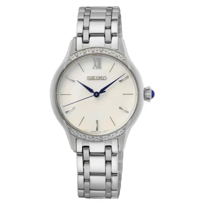 This Seiko Analogue Watch for Women is the perfect timepiece to wear or to gift. It's Silver 30 mm Round case combined with the comfortable Silver Stainless steel watch band will ensure you enjoy this stunning timepiece without any compromise. Operated by a high quality Quartz movement and water resistant to 5 bars, your watch will keep ticking. Elegant, simple and classic watch, suitable for the everyday life. High quality 19 cm length and 13 mm width Silver Stainless steel strap with a Fold over with push button clasp Case diameter: 30 mm,case thickness: 6 mm, case colour: Silver and dial colour: Mother of pearl