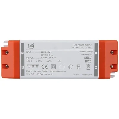 SeKi Slim constant voltage LED transformer 220-240V (AC) to 12V (DC) with 30W / 2.5A power. Compact design: 170 x 57 x 32 mm; IP20 protected with MM/furniture approval SeKi Triac (phase and phase control) 1-100% dimmable LED drivers allow precise control of the light, from gentle accents to bright illuminations - according to your wishes. Easy installation: our LED switching power supplies are designed to integrate seamlessly into your lighting concept. The slim profile allows for discreet installation while achieving impressive lighting effects. DURABILITY AND RELIABILITY Rely on the longevity of our products. Our LED switching power supplies are designed for a long service life to provide you with long-lasting brilliant lighting. Since we attach great importance to safety, we produce our power supplies according to SELV, MM (furniture approval), protection class 2. The SeKi transformers meet the following standards: EN61347-1, EN61347-2, UL8750+1310, EN55015, EN61547, EN61000-3-2, Directive 2009/125/EC, ERP: EU2019/2020, Weight: 0.81350574678 Pounds, Manufacturer: Matrix Handels GmbH