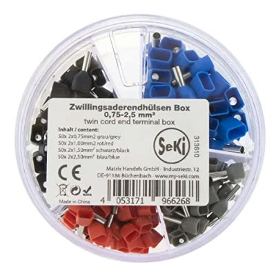 SeKi twin wire end ferrules assortment 200 pieces from 0.75 - 2.50 mm² in a practical shaker box, stackable and resealable The twin ferrules are sorted as follows: 50 x 2 x 0.75 mm² grey, 50 x 2 x 1.00 mm² red, 50 x 2 x 1.50 mm² black, 50 x 2 x 2.5 mm² blue Our shaker has a rotating lid with opening for removing the individual twin wire end ferrules ✅ HIGH QUALITY - The sleeves are manufactured to DIN standard, which ensures a reliable and secure connection and meets European quality standards. ✅ EASY TO USE - The sleeves are easy to crimp, making work easier and ideal for both professional electricians and DIY enthusiasts.