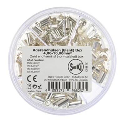 SeKi wire end ferrules assortment from 4.0 - 16.0 mm² in a practical shaker box, stackable and resealable The ferrules are assorted as follows: 150 x 4.0 mm², 75 x 6.0 mm², 75 x 10.0 mm², 50 x 16.0 mm² Our shaker has a rotating lid with opening for removing the individual wire end ferrules, Manufacturer: Matrix Handels GmbH