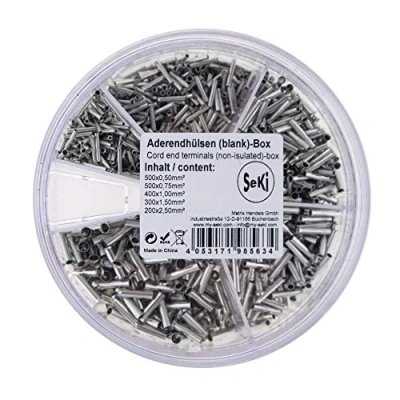Extensive assortment from SeKi: a total of 1,900 pieces of wire end ferrules uninsulated from 0.50 mm² to 2.50 mm² for a wide range of applications ✅ Various cross sections: 500 pieces 0.50 mm², 500 pieces 0.75 mm², 400 pieces 1.00 mm², 300 pieces 1.50 mm², 200 pieces 2.50 mm² - suitable for different cable thicknesses Sleeve length: 0.50 mm² and 0.75 mm² = 8 mm; 1.00 mm², 1.50 mm³ and 2.50 mm² = 10 mm Easy to use: easy to crimp and connect, ensures reliable electrical contacts Non-insulated design: ideal for applications where no insulation is required, e.g. for subsequent connection or crimp work Our shaker has a rotating lid with opening for removing the individual ferrules, Manufacturer: Matrix Handels GmbH