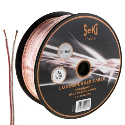 Excellent sound quality - The 100 metre SeKi speaker cable impresses with its 2 x 0.50 mm² strong cables and ensures low-loss signal transmission. Ideal for all applications where reliable and clear sound is required from stereo to home theater. ✅ 100 METRES CLEAR - The speaker cable comes as a 100 metre spool - perfect for custom cuts as needed. Whether short distances or longer connections, you stay flexible. ✅ FLEXIBLE & DURABLE - The flexible PVC jacket protects the cable from external influences and makes installation easy - whether in the living room, music studio or in the car. Easy to use - Thanks to the easily distinguishable wires (by colour marking or repeating labelling), the cable can be connected quickly and easily. Ideal for speaker connections with free cable length. ✅ UNIVERSAL USE - Suitable for HiFi systems, surround systems, car hifi, PA systems, amplifiers, receivers and more. Certified and tested – SeKi speaker cables have a declaration of performance according to the EU Building PVO No. 305/2011 and are therefore suitable and approved for permanent installation (including flush-mounted) inside buildings.
