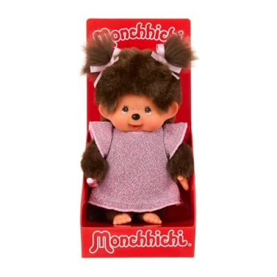 Cute Monchhichi girl in pink glitter dress and pink bows in hair, size approx. 20 cm The face, hands and feet of the monkey like doll are made of plastic The brown fur is made of particularly soft plush and invites you to cuddle, play and love The Monchhichi holds a dummy in his right hand that it can put in the mouth Gift for birthdays, Christmas and Easter for children, lovers, collectors and nostalgics, Manufacturer: Sekiguchi Co. Ltd.