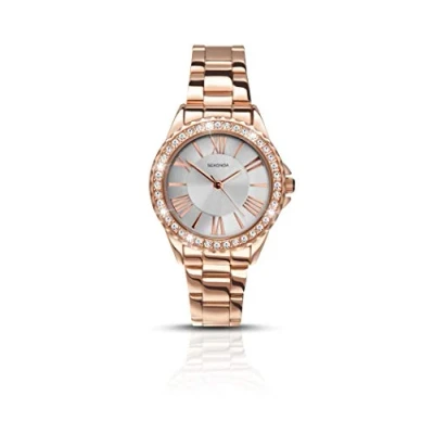Rose gold plated stone set case Silver sunray dial with roman numerals Rose gold plated stainless steel bracelet 2 year guarantee Target gender: female Display type: Analog Band size: Womens Standard Band width: 14.0 Case diameter: 36.0 millimeters Dial window material type: Mineral Item shape: Round Water resistance depth: 30.0 meters Calendar type: Does not have a date function; Clasp type: Double fold over clasp with safety