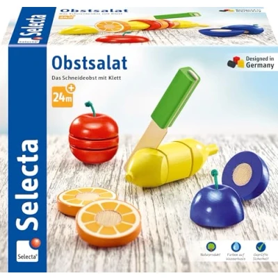 Selecta 62070 Fruit Salad Hook and Loop Wooden Cutting Toy 11 Piece Kitchen Set