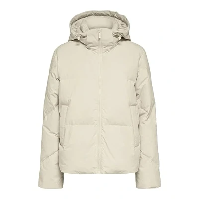 High collar Removable and adjustable hood Long sleeves with storm cuffs Material Composition: Outer Material: 50% Recycled Nylon, 50% Nylon; Filling: 50% ReDown Feathers, 50% Down; Lining: 100% Recycled Polyester
