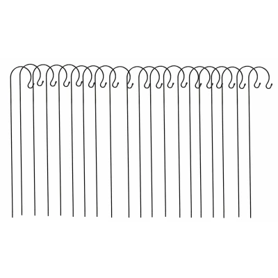 General description These black border garden shepherds crook hooks are perfect for hanging various garden accessories and can be positioned anywhere in your garden where the ground is soft. They are ideal for use in flowerbeds, lawns, amongst trees, shrubs, and meadows. These hooks can be utilized to hang bird feeders, create ambiance with lights such as candle lanterns or solar lights, and even guide guests at events like weddings or parties. Technical specifications Height: 1.2m Pole diameter: 0.6cm Hook size: 12cm Smaller hook size: 4.5cm Other information Made from durable powder-coated steel for weather resistance Includes protective rubber stoppers on hooks for safety around children Set of 20 hooks
