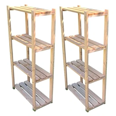 General description This double pack of 4-tier wooden shelving racks is designed for use in greenhouses but is versatile enough for various settings such as garages, utility rooms, sheds, or anywhere you need to keep items organized. The well-made, free-standing units come flat packed and require home assembly, with all fixings included. Each unit features four shelves that maximize available space, with a load limit of 20kg per shelf, providing a simple and elegant solution to declutter your space. Technical specifications Dimensions: W 65cm x D 30cm x H 130cm Load limit per shelf: 20kg Set of 2 units Installation Flat packed for home assembly All fixings included