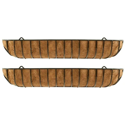 General description These popular wall troughs are large enough to produce masses of color from your plantings. At 120cm in length, they create a substantial yet beautiful figure on any wall or fence. They are lined and ready for planting with your choice of flowers wherever they are sited. These heavy-duty metal wall baskets are made from solid rod steel and feature strong welded joints, ensuring long-lasting use. A tough epoxy coating provides durability and gives the baskets a wrought iron look. Technical specifications Dimensions: 20cm L x 120cm W x 22cm H Bar thickness: 4mm Material: Solid rod steel Coating: Tough epoxy for durability Set of 2