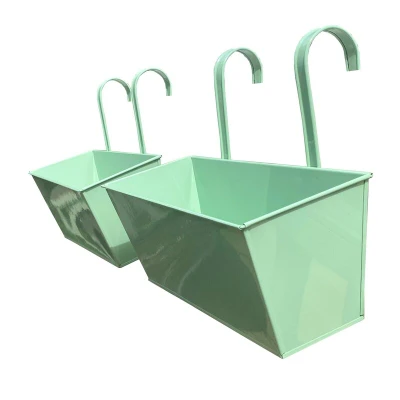 General description A lovely set of hanging planters that are ideal for growing flowers and herbs in the garden or home. Each metal planter is finished in a stylish sage green colour. They feature two generous hooks at the back for easy hanging in various locations, such as over railings, fencing, or even old garden furniture for an artistic effect. This unusual design makes a lovely gift for occasions like Mother's Day, Valentine's Day, Christmas, or a special anniversary. Gifted as is or planted up, these planters are a welcome addition to any growing space. Technical specifications Dimensions: 40cm W x 16cm L x 16cm H Material: Metal Colour: Sage Green Set of 2 planters Usage Ideal for growing home-grown herbs and flowers Can be hung over railings, fencing, or garden furniture