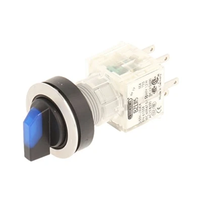 Club selector switch in stainless steel, blue backlit toggle with 3 rastenden, at 10, 12 and 14 Installation opening diameter of 22,3 mm and flat front frame height of 2 mm Illuminated Push Button Contact Geber with 2 N/O Contact, designed for 250 V/6 A and a 24 V LED Connection Type: Single Flat Connector 2.8 mm x 0.8 mm IP protection rating: IP 65