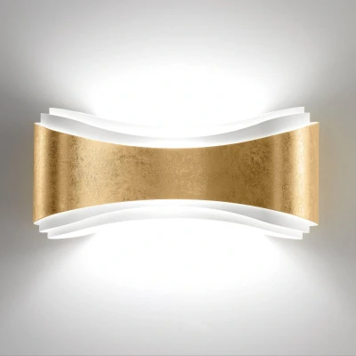 Noble LED wall lamp Ionica with gold leaf detail The Ionica wall lamp is unique in its appearance and stylishly sets a hallway or living area in scene. It consists of three layers of steel, which with their different sizes give the lamp a flowing form. The rear layers are painted in plain white, leaving the focus clearly on the front steel layer, which is covered with precious gold leaf. To ensure that Ionica remains an eye-catcher in the dark, the wall lamp has been fitted with an LED that distributes its warm white light from the ceiling to the floor. The wall lamp is manufactured in Italy. Here the three steel sheets are cut into shape with the help of a laser. Afterwards the leaves are bent by hand and assembled to this shapely lamp.