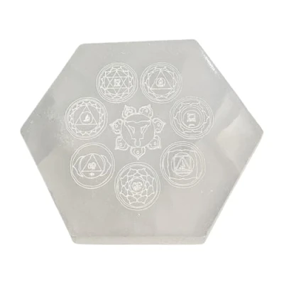 Selenite Charging Plate, Hexagonal, Etched, Design #02, 8cm