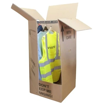 DURABLE CARDBOARD WARDROBE BOXES: Double Wall Removal Moving Wardrobe Cardboard Boxes Measures 460mm x 520mm x 1040mm (46cm x 52cm x 104cm) Engineered with sturdy double-wall cardboard, these wardrobe storage boxes ensure your garments are protected during moves or storage, offering reliable durability for repeated use. EFFORTLESS ASSEMBLY & TRANSPORT: Designed for convenience, these cardboard wardrobe boxes are easy to assemble and lightweight, simplifying the moving process. With pre-cut handles and simple setup, transporting your clothes becomes hassle-free. OPTIMAL CLOTHING ORGANISATION: Featuring a universal hanging rail, these wardrobe boxes offer versatile storage options for various clothing types. Whether it's suits, dresses, or coats, your garments remain neatly organized and easily accessible. ECO-FRIENDLY SOLUTION: Made from recycled materials and fully recyclable, these cardboard wardrobe boxes offer an eco-friendly solution for your moving and storage needs. Reduce your environmental footprint while safely transporting your belongings. MULTIPURPOSE USAGE: Beyond moving house, these wardrobe boxes are ideal for temporary storage solutions or organizing seasonal clothing. Their versatility makes them indispensable for decluttering and simplifying your living space.