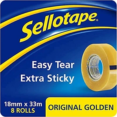 The nation's favourite sticky tape. Extra strong and extra sticky. Golden in colour, but clear when applied. Easy tear, no need for teeth. Small core. Size: 18mm x 33m. Pack of 8.