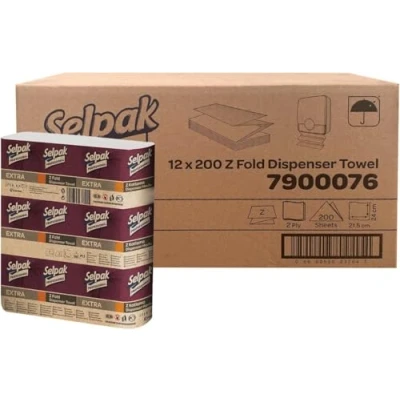 Amazon SELPAK Professional White Z Fold Paper Towels: 2ply 21.5cm x 24cm Luxury Hand Towels. Contains 12 packs including 200 sheets,2400 in total. Made from pure cellulose for greater absorbency and strength Premium Quality: While it provides high absorbency, it does not tear easily or disintegrate when exposed to liquid. Effectively dry hands and help to maintain good hygiene. Ideal for frequent use as a paper towel. It is soft and gentle on the skin Compatiable: White hand towels are compatible with a variety of common paper towel dispensers that are designed to dispense Z fold or interfolded towels Efficient Dispensing: Hand towel offers a superior, fast, and high-quality experience. Designed to dispense one towel at a time, which helps to reduce waste and ensure that users only take what they need Multiuse: Paper hand towels are designed to provide a hygienic and efficient hand-drying solution for professional or commercial settings, such as restaurants, hotels, offices, and hospitals