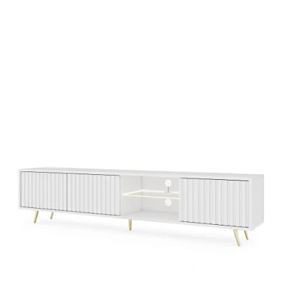 SELSEY Bello Wooden TV Cabinet in White 175 x 43 31 cm, Elegant Slatted MDF Fronts & Gold Metal Legs, Fits TVs Up to 75 Inch, 3 Spacious Compartments Glass Shelf with LED, for Modern Living Rooms