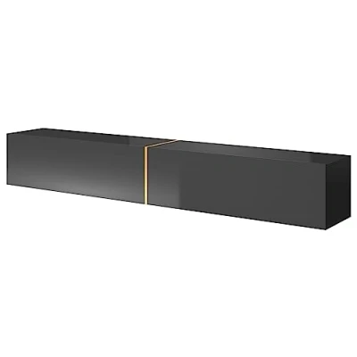 Sleek Modern Elegance: Transform your living space with the Bisira wooden TV cabinet, a fusion of bold black matte body coupled with a glossy front, accentuated by a gold stripe. It's not just a practical storage solution; it's a statement of sophistication and class that complements any contemporary decor. Perfect for displaying your 75" TV in style, it offers ample room to showcase your favourite decor, effortlessly blending into your lifestyle and providing a touch of luxury. Maximised Storage & Organization: The Bisira wooden TV unit boasts two spacious drop-down compartments perfect for organizing electronics, cables, and documents, ensuring a clutter-free environment. This TV stand is designed to meet the needs of a modern household, providing easy access and maintaining a tidy appearance. The unit’s innovative floating design enhances your floor space, illustrating its capacity not just for storage, but for creating a sleek, dynamic room. Durable & Resilient Construction: Crafted from 16 mm laminated board, the Bisira TV cabinet resists moisture and scratches, ensuring it stands the test of time. It provides peace of mind knowing your investment will remain as stunning as the day you bought it. The durable build supports up to 14 kg, ensuring it safely houses your entertainment essentials while maintaining its robust appearance and functionality throughout daily use, making it an indispensable addition to your living room. Versatile Display Options: The top surface of the Bisira TV stand doubles as an exhibition space for your cherished decor or personal items, allowing you to personalise your space and reflect your style. Its width of 200 cm offers significant space to beautifully arrange and frame your belongings, helping you express your personality while enhancing the aesthetic value of any room. Seamlessly enhance room ambiance with this key feature that blends decorative appeal with practicality. Sophisticated Solution for Large TVs: Ideal for TVs up to 75 inches, this TV cabinet offers a bold black and gold aesthetic that easily accommodates and accentuates large screen displays. Embrace the perfect blend of functionality and style, where the entertainment unit becomes the centrepiece of your living room. Whether entertaining guests or enjoying a quiet night in, the Bisira ensures your living room radiates a modern, clean, and sophisticated aura, elevating your viewing experience.