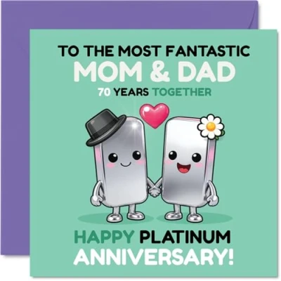 Brimming with joy, this card's cheerful cartoon couple captures the warmth and love of an incredible 70 years together. Anniversary card for Mum & Dad with a light-hearted design style Features a fun design in green, pink and silver, with a lively celebration scene that highlights the special platinum anniversary. Recyclable and printed in UK for a considerate choice Printed on glossy single-sided board and uncoated inside for easy writing. No smudging when writing inside. Made with FSC certified board. Printed on 360 micron stock for a confident, premium feel Inside message: Mum & Dad. Supplied with a quality envelope to complete your thoughtful gesture. The 145mm Square format is convenient to display or post Designed and printed in the UK using recyclable materials for a card that's thoughtful on every level. A thoughtful choice that helps you send smiles and warm wishes