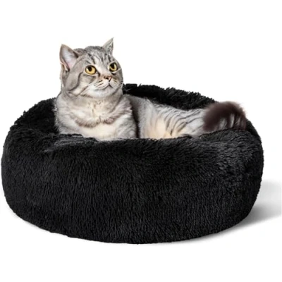 SEOUGEE Calming Donut Cat Bed, Fluffy Plush Round Dog Cosy Soft Washable Cushion Warming Pet Beds with Non Slip Bottom, Indoor Sleeping Cuddler Nest for Cats Puppy Kitten (Black 40cm)